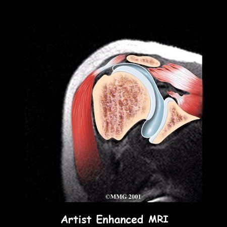An MRI scan is a special imaging test that uses magnetic waves to create pictures of the shoulder in slices. The MRI scan shows tendons as well as bones. This test is painless and requires no needles or injections.
