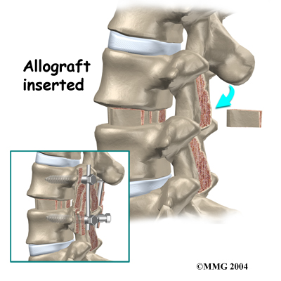 Another option is to use a wedge of hard, cortical bone taken from preserved human bone. This source of bone graft is called allograft. During the PLIF procedure, the cage or bone wedge is implanted into the interbody space. The PLIF method provides a large surface area for fusion to occur.