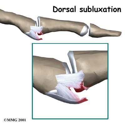 Injury to the volar plate can occur when the joint is hyperextended. If a complete tear occurs, the ligament usually ruptures or tears from its attachment on the middle phalanx.