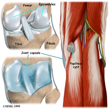 A popliteal cyst may form after damage to the joint capsule of the knee. The weakening of the joint capsule in the damaged area can cause the small sac of fluid to form. This can lead to a bulging of the joint capsule, much like what occurs when an inner tube bulges through a weak spot in a tire. The cyst may become larger over time.