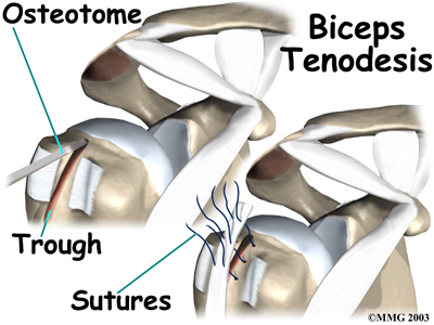 After the acromioplasty procedure, the surgeon focuses on the biceps tendon. When the bicipital groove is in view, the transverse humeral ligament is cut. Next, an osteotome is used to open the joint capsule and create a trough next to the bicipital groove. Three small holes are drilled along each side of the trough. The surgeon places the loose end of the biceps tendon in the new groove.