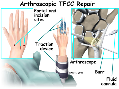 The outside perimeter of the TFCC has a good blood supply. Tears in this area can be repaired. There is no potential for healing when tears occur in the central area where there is no blood supply. In these cases arthroscopic debridement of the damaged tissue is required.