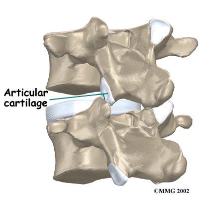 The surfaces of the facet joints are covered by articular cartilage. Articular cartilage is a smooth, rubbery material that covers the ends of most joints. It allows the ends of bones to move against each other smoothly, without friction.