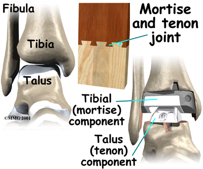 The tibial component is usually made up of two parts: a flat metal piece called a metal tray that is attached directly to the tibia bone, and a plastic cup that fits onto the metal piece, forming a socket for the artificial ankle joint. The talus component is made of metal and fits into the socket of the tibial component.