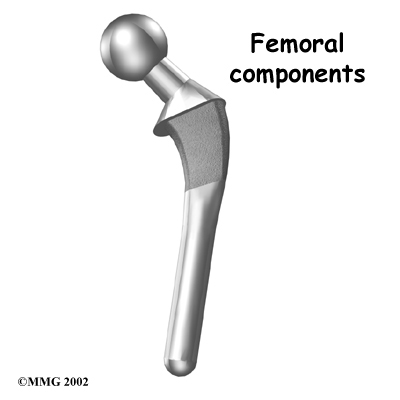 The femoral component (stem and ball) replaces the femoral head. The femoral component is made of metal. Sometimes, the metal stem is attached to a ceramic ball.