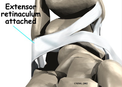 A large band of connective tissue crosses the front of the ankle just below the lateral ligaments. This band, called the ankle retinaculum, holds the tendons in place. The surgeon pulls the top edge of the ankle retinaculum upward and sews it into the fibula. This helps reinforce the reconstructed ligaments.