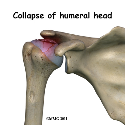 Osteonecrosis of the humeral head is a condition where a portion of the bone of the humeral head (the top of the humerus or upper arm bone) loses its blood supply, dies and collapses. Another term used for osteonecrosis is avascular necrosis. The term avascular means that a loss of blood supply to the area is the cause of the problem and necrosis means death.