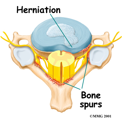 Heavy, repetitive bending, twisting, and lifting can place extra pressure on the shock-absorbing nucleus of the disc. A blow to the head and neck can also cause extra pressure on the nucleus. If great enough, this increased pressure can injure the annulus (the tough, outer ring of the disc). If the annulus ruptures, or tears, the material in the nucleus can squeeze out of the disc. This is called a herniation.
