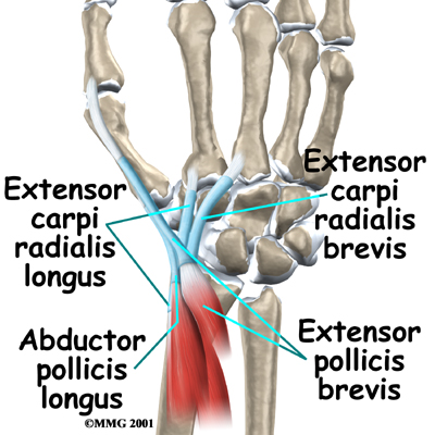 Wrist extensor tendons work like the bow used by violin players. The wrist extensor tendons are like the bow, and the thumb muscles are like the strings. As the wrist curls down and in, the wrist tendons rub back and forth against the thumb muscles. The friction builds up, much like the effect of rubbing two sticks together. This can lead to irritation and inflammation of the tenosynovium covering the wrist extensor tendons.