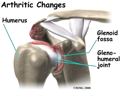 When the rotator cuff is torn, the shoulder becomes unbalanced. The deltoid muscle pulls the head of the humerus up into the acromion in a sliding motion rather than in the smooth balanced movement that the shoulder was designed to undergo. Over time this abnormal sliding motion causes wear and tear on the joint surfaces, which is termed arthritis. Due to the arthritis, motion of the shoulder becomes painful and the shoulder becomes weaker and weaker until you can no longer raise the arm above the head.
