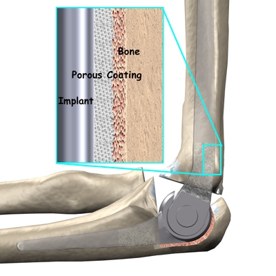 There are two different ways to hold the artificial elbow in place. A cemented prothesis uses a special type of epoxy cement to glue it to the bone. The uncemented prosthesis has a fine mesh of holes on the surface. Over time, the bone grows into the mesh, anchoring the prosthesis to the bone.