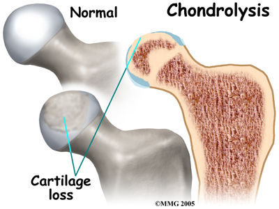 There are two complications of SCFE that may occur immediately after the condition develops. The first complication is chondrolysis, a condition where the articular cartilage of the hip joint is destroyed. Articular cartilage is the smooth material that covers the joint surface. It is unclear why this condition develops. It may occur if the SCFE has been treated with or without surgery. This condition results in narrowing of the joint space and a painful, stiff hip.