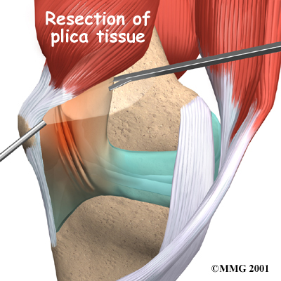 If all nonsurgical attempts to reduce your symptoms fail, surgery may be suggested. Usually, an arthroscope (mentioned earlier) is used to remove the plica. The small TV camera is inserted into the knee joint through one-quarter inch incisions. Once the plica is located with the arthroscope, small instruments are inserted through another one-quarter inch incision to cut away the plica tissue and remove the structure. The area where the plica is removed heals back with scar tissue. There are no known problems associated with not having a plica, so you won't miss it.