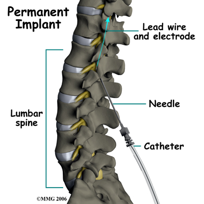 The procedure for permanent placement of the spinal stimulator is very similar to the trial. The new electrodes can be placed in the same way using the needle technique, or if more precise placement is needed a small incision may be necessary over the spine. The wires are then tunneled under the skin to the area where a small incision is made to place the stimulator device under the skin. If your pain is in your legs, an incision for the device is made on your lower abdomen or upper buttock and the wires are placed in the low back.