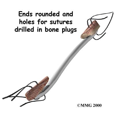 A small incision is also made below the patella. Working through this incision, the surgeon takes out the middle section of the patellar tendon, along with the bone attachments on each end. The bone plugs are rounded and smoothed. Holes are drilled in each bone plug to place sutures (strong stitches) that will pull the graft into place.