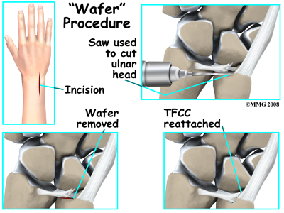 Arthroscopic debridement works well for simple tears. Much of the damaged tissue can be removed while still keeping a stable wrist joint. The torn structures can be reattached with repair sutures. Some surgeons perform an arthroscopic wafer procedure (see below) in addition to the TFCC debridement especially when both TFCC disruption and positive ulnar variance are present. Further studies are needed to see if the combined procedure results in a more satisfactory outcome than current methods and to evaluate the rotational loss that can occur with this combined procedure.