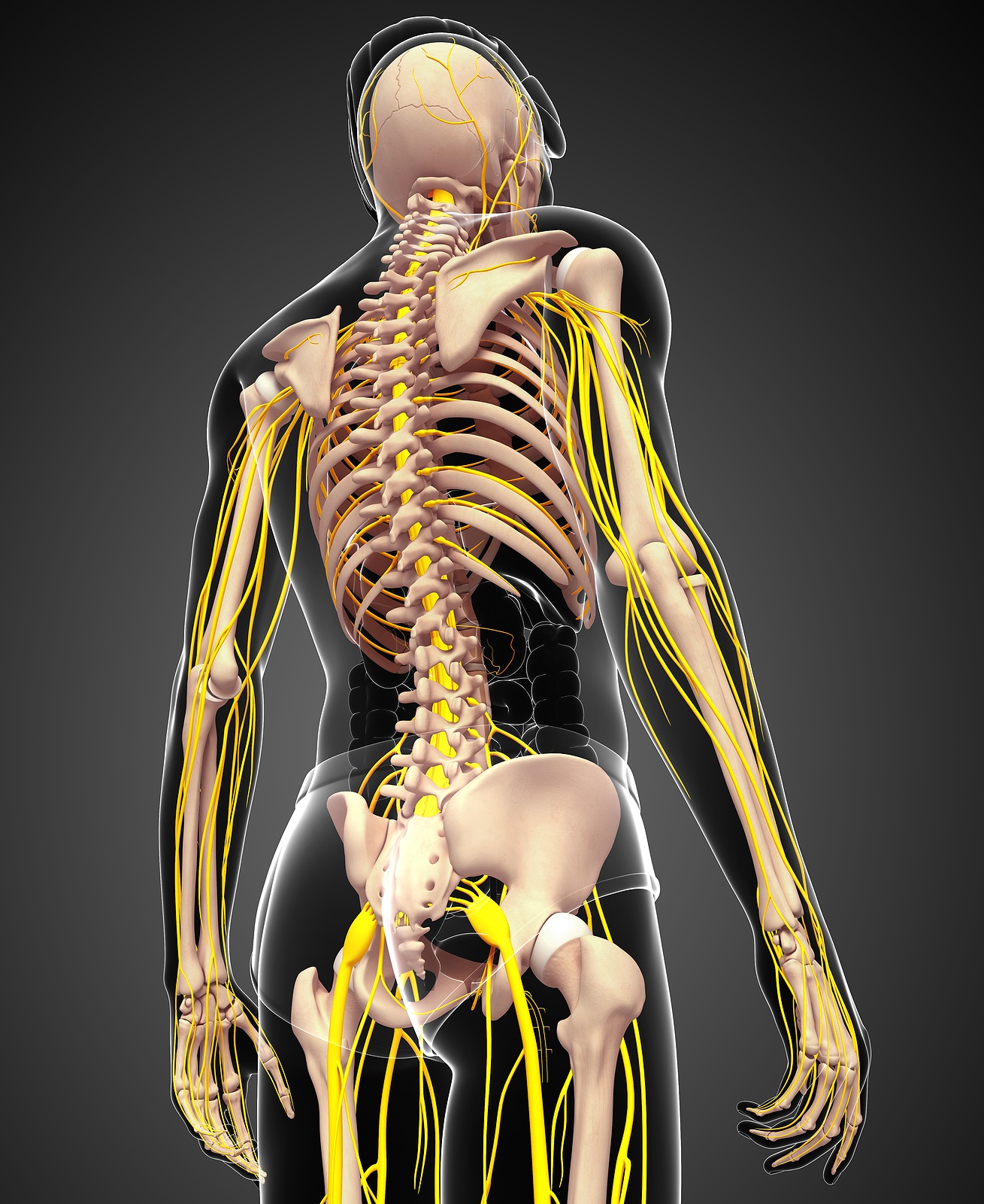 The spinal cord also consists of nerve roots that extend from the sides of vertebrae. Networks of nerve roots allow long nerve fibers to travel throughout the body and form the body’s electrical system. The nerve roots and fibers along the cervical spine extend to the neck, shoulders, arms, and hands. The nerves in the thoracic spine travel into the chest and abdomen. Nerve roots that originate in the lumbar spine consist of nerve fibers that travel to the lower regions of the body such as the pelvis, hips, thighs, legs, and feet.