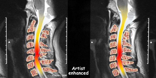 The changes that happen with degeneration and disc herniation can choke off the blood supply to the spinal cord. The sections of the spinal cord that don't get blood have less oxygen and don't function normally, which leads to symptoms of myelopathy.