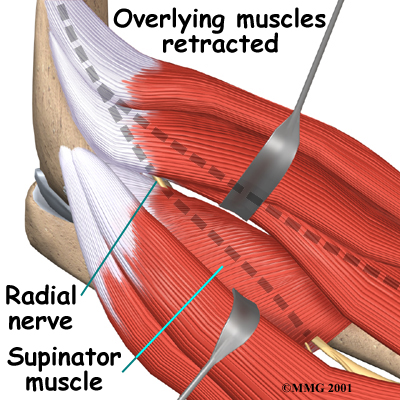 Soft tissues are gently moved aside so the surgeon can check the places where the radial nerve may be getting squeezed within the radial tunnel. The nerve can be pinched in many spots, so it is important to check all the areas that may be causing problems. Any parts of the tunnel that are pinching the nerve are cut. This expands the tunnel and relieves pressure on the nerve. At the end of the procedure, the skin is stitched together.