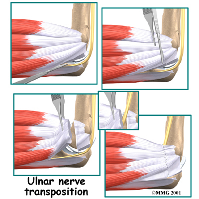 One method is called ulnar nerve transposition. In this procedure, the surgeon forms a completely new tunnel from the flexor muscles of the forearm. The ulnar nerve is then moved (transposed) out of the cubital tunnel and placed in the new tunnel.