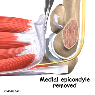 The other method simply removes the medial epicondyle on the inside edge of the elbow, a procedure called medial epicondylectomy. By getting the medial epicondyle out of the way, the ulnar nerve can then slide through the cubital tunnel without pressure from the bony bump.