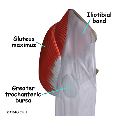 The bursa next to the greater trochanter is called the greater trochanetric bursa. The gluteus maximus is the largest of three gluteal muscles of the buttock. This muscle spans the side of the hip and joins the iliotibial band. The iliotibial band is a long tendon that passes over the bursa on the outside of the greater trochanter. It runs down the side of the thigh and attaches just below the outside edge of the knee.