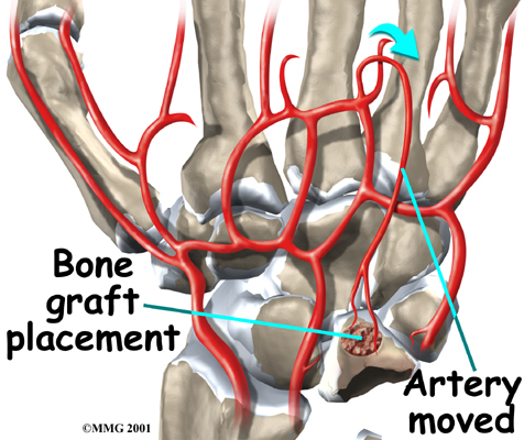 Stage two and stage three Kienbock's disease often require surgery when immobilizing the wrist doesn't help. Attempts to restore the blood flow to the lunate are most likely to be successful when the disease is in the early stages. The procedure to restore blood flow is called revascularization. During the operation, the surgeon moves a small section of blood vessels (and also possibly bone) from elsewhere on the wrist. The segment is attached to the deteriorating lunate bone. This is done to restore blood flow to the lunate and halt its deterioration. This is a newer procedure to treat Kienbock's disease and is not always successful. Vascularized bone graft does have the advantage of implanting live bone with a ready made blood supply.If this is successful, the bone heals and the blood supply in the transferred bone fragment grows into the rest of the lunate to restore the blood supply to the entire lunate.
