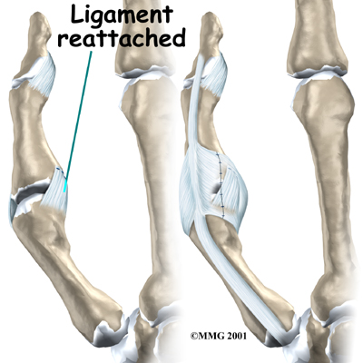This helps expose the MCP joint and the ligaments. The area around the injury is examined for any soft tissue damage. Your surgeon then repairs the ligaments with stitches that anchor them back to the bone.