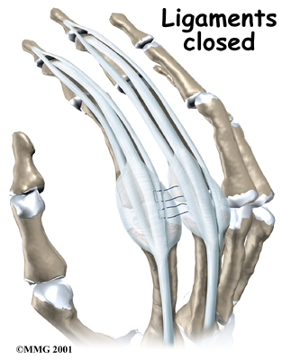 When the new joint is in place, the surgeon wraps the joint with a strip of nearby ligament to form a tight sac. This gives the new implant some added protection and stability.