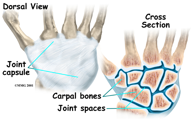 The ligaments allow the bones to move in all directions. These ligaments meld together to form the joint capsule of the wrist. The joint capsule is a watertight sac of tissue that surrounds the wrist bones. Inside the wrist capsule are the joints themselves. The joint capsule contains a small amount of lubricant, called synovial fluid, that allows the bones to move together easily. The many tendons required to move the fingers run just outside the joint capsule.