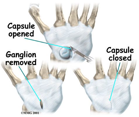 To remove a dorsal wrist ganglion, a small incision is made in the back of the wrist. The tendons that run across the back of the wrist and into the fingers are retracted (or moved) out of the way. This allows the surgeon to see the ganglion and follow it down to where it attaches to the wrist capsule. Once the surgeon locates this stalk, the entire ganglion is removed, including the area where it attaches to the joint capsule. The joint capsule may or may not need to be repaired with sutures. Finally, the skin incision is closed with sutures.