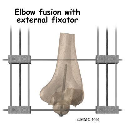 An external fixator involves placing metal pins through the bones above and below the elbow joint. Your surgeon may also place a metal screw inside the ulna and humerus to pull the bones together. The external fixator device is then placed on the elbow outside the skin, after the incision is sewn up. The external fixator attaches to the metal pins, which come through the skin, with metal rods and bolts.