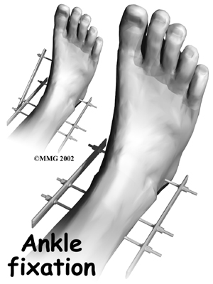 In some cases, especially if the fusion is being done because of an infection or a failed initial fusion, an apparatus called an external fixator is used to hold the bones together while they heal. This apparatus has metal pins that are inserted through the skin and into the bone. The metal pins are connected to metal rods and bolts outside the skin that hold the bones in position while the ankle fuses. The fixator is removed after the bones have healed, usually in 12 to 15 weeks.