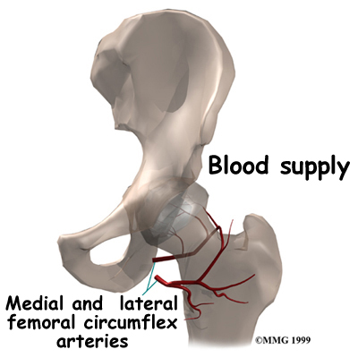 All of the blood supply to the femoral head (the ball portion of the hip) comes through the neck of the femur. If this blood supply is damaged, there is no backup. One of the problems with hip fractures is that damage can occur to these blood vessels when the hip breaks. This can lead to the bone of the femoral head actually dying. Once this occurs, the bone is no longer able to maintain itself. This can lead to one of the complications of a hip fracture called avascular necrosis (AVN).
