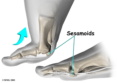The muscles that bend the big toe down (the toe flexors) pass underneath the main joint of the big toe, crossing over the bump formed by the sesamoid bones. This bump acts as a fulcrum point for the toe flexors, giving these muscles extra leverage and power. The sesamoids also help absorb pressure under the foot during standing and walking, and they ease friction in the soft tissues under the toe joint when the big toe moves.