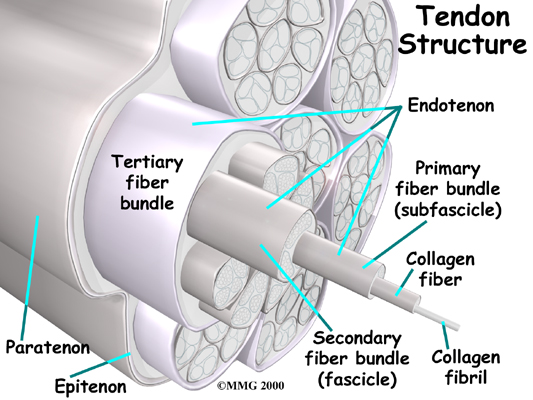 Tendons are made up of strands of a material called collagen. Think of a tendon as similar to a nylon rope and the strands of collagen as the nylon strands. As we age, or repetitively use the tendon, some of the individual strands of the tendon can degenerate, lose normal arrangement due to the degeneration, or break, and the tendon loses strength.