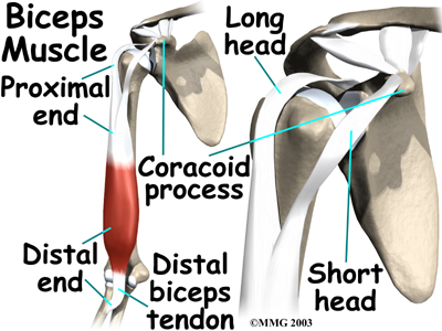 The biceps muscle goes from the shoulder to the elbow on the front of the upper arm. Two separate tendons (tendons attach muscles to bones) connect the upper part of the biceps muscle to the shoulder. The upper two tendons of the biceps are called the proximal biceps tendons, because they are closer to the top of the arm.