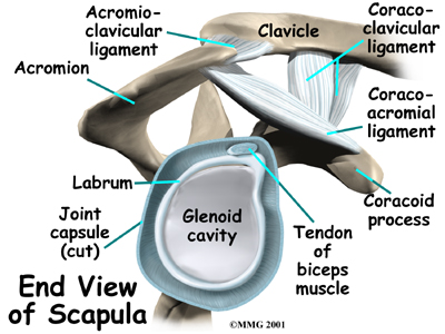 A part of the scapula, called the glenoid, makes up the socket of the shoulder. The glenoid is very shallow and flat. The labrum is a rim of soft tissue that makes the socket more like a cup. The labrum turns the flat surface of the glenoid into a deeper socket that molds to fit the head of the humerus.
