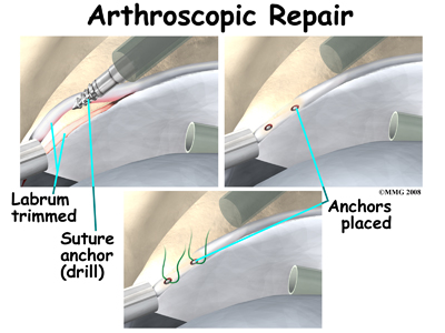 If the tear is larger, the shoulder may also be unstable. If this is the case, the labral tear may need to be repaired, rather than simply removed. Several new techniques allow surgeons to place “anchors” into the bone around the shoulder joint and reattach the labrum using the arthroscope. There are many variations of these anchors, but most are drilled into the bone and have sutures (stitches) attached that are then used to tie the labrum down to the bone and enable the labrum to heal back in the appropriate position.