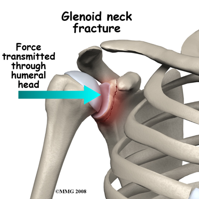 Fractures of the neck of the glenoid occur as a result of lateral compression forces. A blow on the side of the shoulder is transmitted through the head of the humerus to the glenoid. More rarely a fall sideways with the arm out to the side may result in the same type of injury. A very forceful dislocation of the glenohumeral joint might also cause this injury, but fractures of the rim of the glenoid are more common in that situation. Fractures of the neck of the glenoid are also associated with fractures of the blade of the scapula. In most situations the injury can be treated non-operatively.