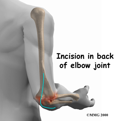 After the anesthesia, the surgeon makes an incision in the back of the elbow joint. The incision is made on the back side because most of the blood vessels and nerves are on the inside of the elbow. Entering from the back side helps prevent damage to them.