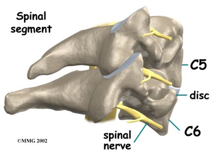 One way to understand the anatomy of the cervical spine to look at a spinal segment. Each spinal segment includes two vertebrae separated by an intervertebral disc, the nerves that leave the spinal cord at that level, and the small facet joints (described later) that link each level of the spinal column.