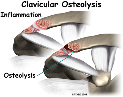 Weightlifters aren't the only ones affected; air-hammer operators, soldiers, handball players, and others can develop this problem. For this reason, it is also known as distal clavicular osteolysis (DCO). Osteolysis refers to the resorption of bone at the site of the injury.