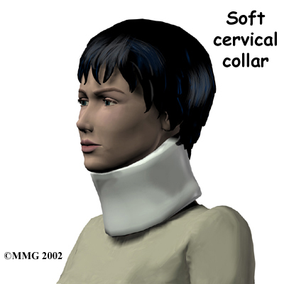 In acute situations, at first your healthcare professional may suggest immobilizing the neck with a soft neck collar. The collar is a padded ring that wraps around the neck and is held in place by a Velcro strap. Keeping the neck still for a short time can calm inflammation and pain. Patients wear the collar during waking hours for up to three months, and only take it off to shower and engage in rehabilitation. Slowly the time that the collar is worn each day is tapered.