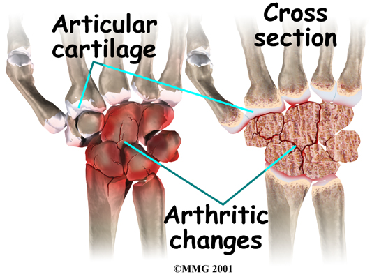 Many of the small joints in the wrist can become arthritic. When this happens, the wrist joint can become extremely painful. Moving your wrist may become difficult because of the pain and stiffness. Your grip can also get weak from the pain. Whenever the hand grips or uses strength in any way, the wrist feels the force. This happens because the muscles running from the forearm to the hand contract, tightening the wrist bones together. This causes pain.