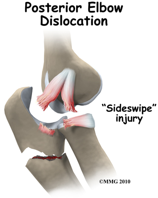 An elbow dislocation can also occur from a sideswipe injury. This type of injury occurs when the driver of an automobile has the elbow out the open window during a car accident. The force of the impact causes a severe fracture-dislocation of the elbow.