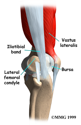 The ITB glides back and forth over the lateral femoral condyle as the knee bends and straightens. Normally, this isn't a problem. But the bursa between the lateral femoral condyle and the ITB can become irritated and inflamed if the ITB starts to snap over the condyle with repeated knee motions such as those from walking, running, or biking.