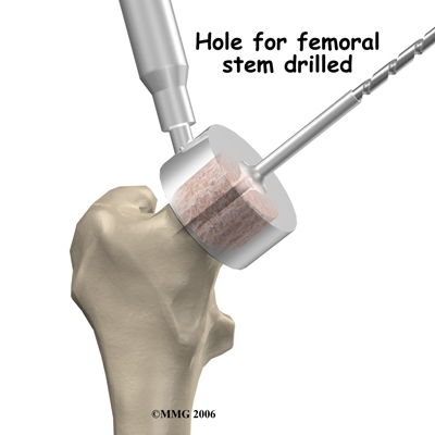 The operation begins by making an incision in the side of the thigh. This allows the surgeon to see both the femoral head and the acetabulum (or socket). The femoral head is then dislocated out of the socket. Special powered instruments are used to shape the bone of the femoral head so that the new metal surface will fit snugly on top of the bone.