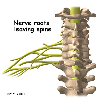 The radial nerve starts at the side of the neck, where the individual nerve roots leave the spine. The nerve roots exit through small openings between the vertebrae. These openings are called neural foramina.