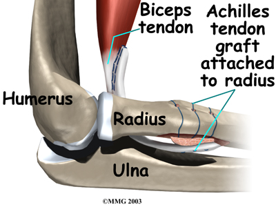 When the Achilles tendon allograft is used, the surgeon leaves a small piece of the heel bone attached to the piece of tendon. Small holes are drilled into the piece of bone. Sutures are woven through these holes and will later be used to secure the end of the graft to the radial tuberosity. In this way, the graft will have a bone-to-bone connection that heals together. The healed bone solidly fixes the the graft to the radial tuberosity. After the graft is in place, its top end is then stitched over the front of the biceps muscle.